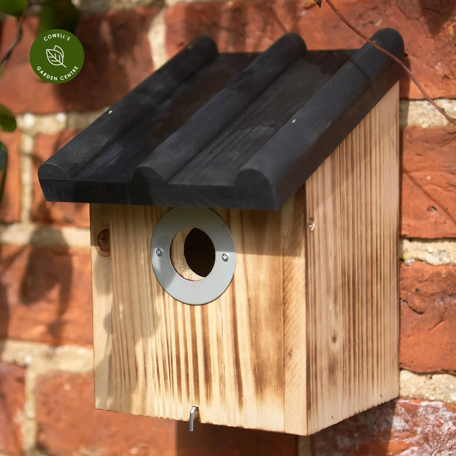 Featuring the Tom Chambers label, the traditional nest boxes are crafted in the UK from sustainable wood. The range includes a small sized entrance to encourage as wide a range of birds with safety and security.