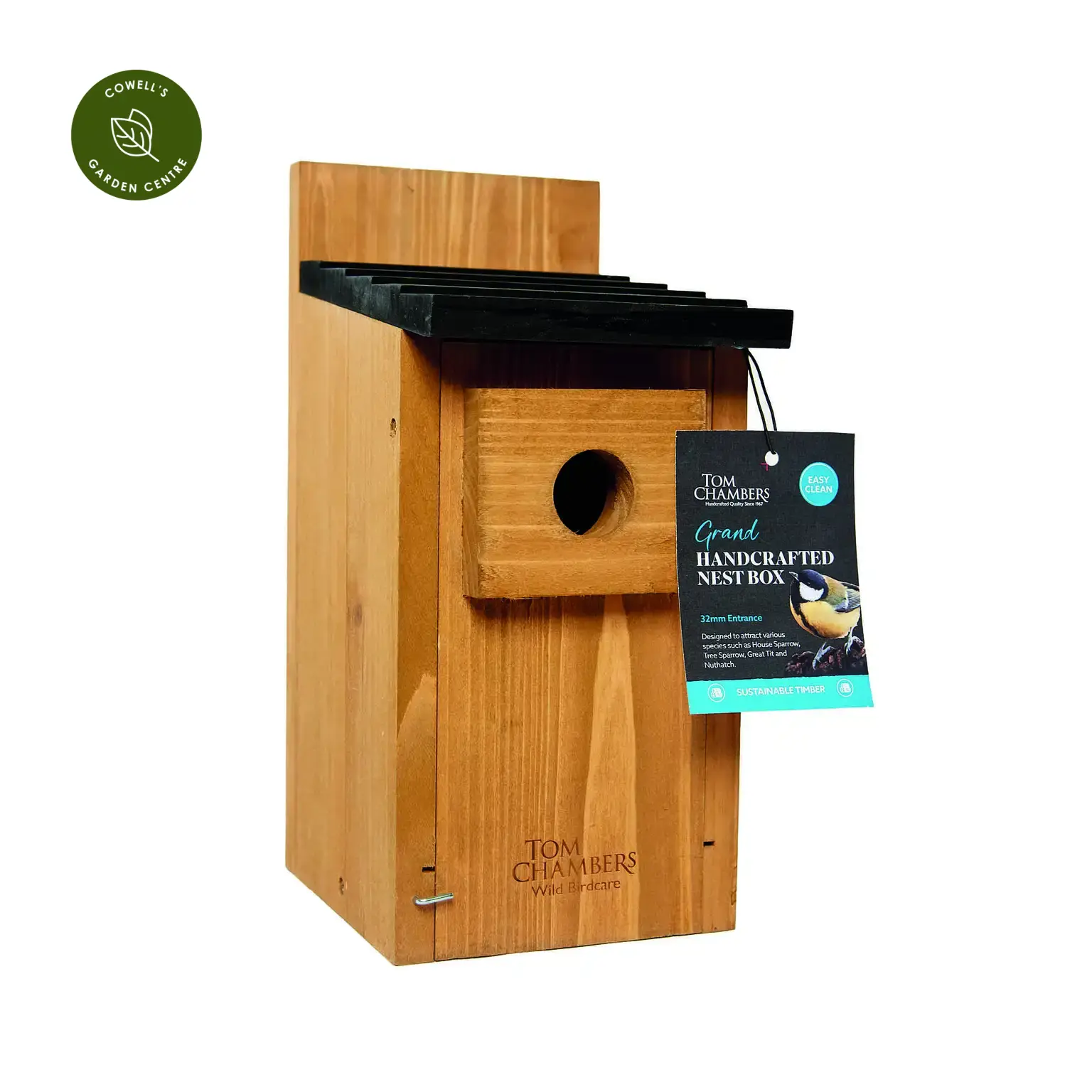 Featuring the Tom Chambers label, the traditional nest boxes are crafted in the UK from sustainable wood. The range includes a small sized entrance to encourage as wide a range of birds with safety and security.