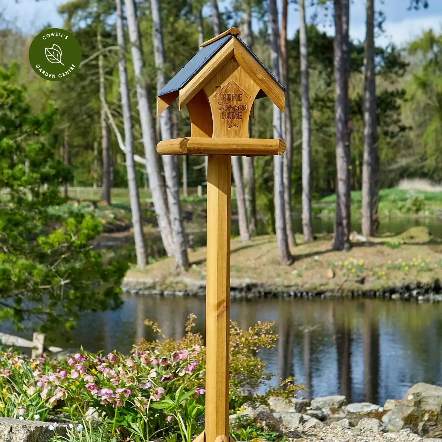 Attractive, square bird table with slate roof, making a spectacular garden feature. Features natural finish timber for a simple but stylish piece.