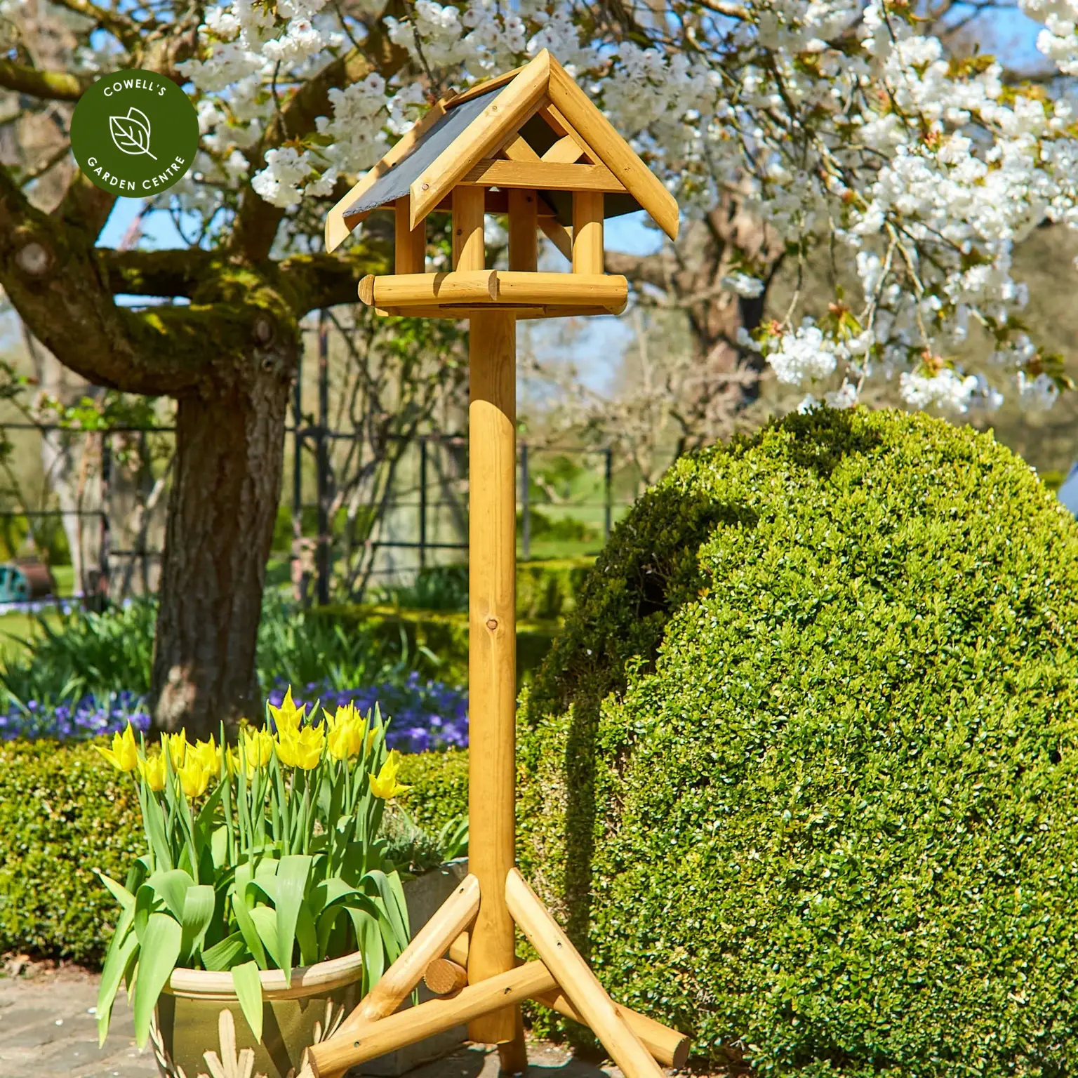 Attractive, square bird table with slate roof, making a spectacular garden feature. Features natural finish timber for a simple but stylish piece.