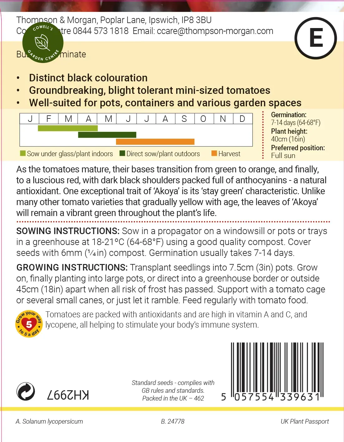 The 20-30g cocktail size fruit have exceptional flavour. One exceptional trait of 'Akoya' is its 'stay green' characteristic. Unlike many other tomato varieties that gradually yellow with age, the leaves of 'Akoya' will remain a vibrant green throughout the plant's life. Height: 45cm (18in). Spread: 25cm (10in).