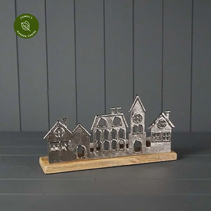 Metal town scene, casting a cosy glow when candles are placed behind.