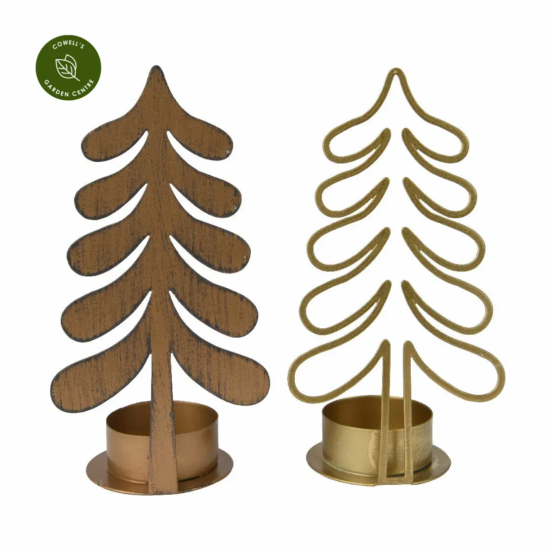 Gold metal Christmas tree with tealight holder, to create a soft silhouette.