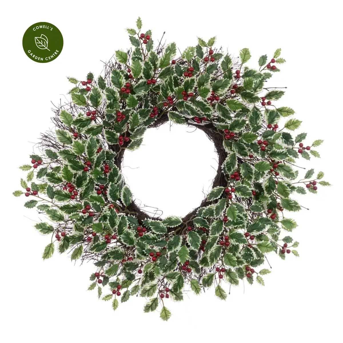 Soft foliage wreath bearing variegated leaves and holly berries, to use as a table decoration, on your door, or to elevate your Christmas displays.
