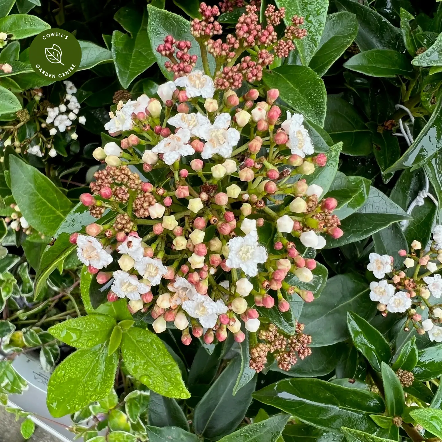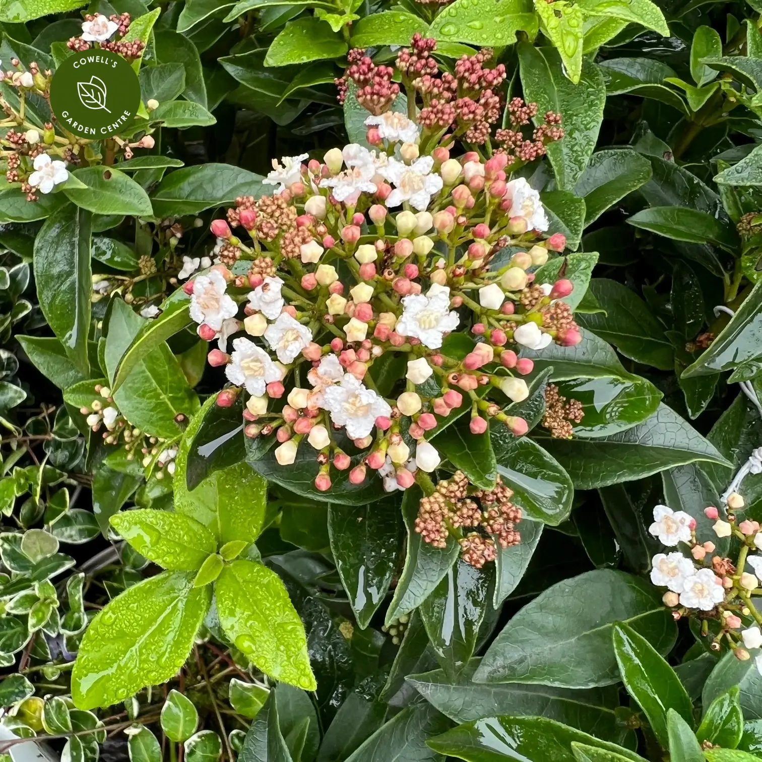 Viburnum tinus is an elegant evergreen shrub presented here as a 50cm stem standard, creating a neat lollipop-shaped form ideal for entrances, patios or formal planting schemes. It features glossy, dark green foliage that provides year-round structure, with clusters of pink-flushed buds opening to creamy-white flowers from winter through spring. These are followed by shiny black berries that extend the season of interest.
