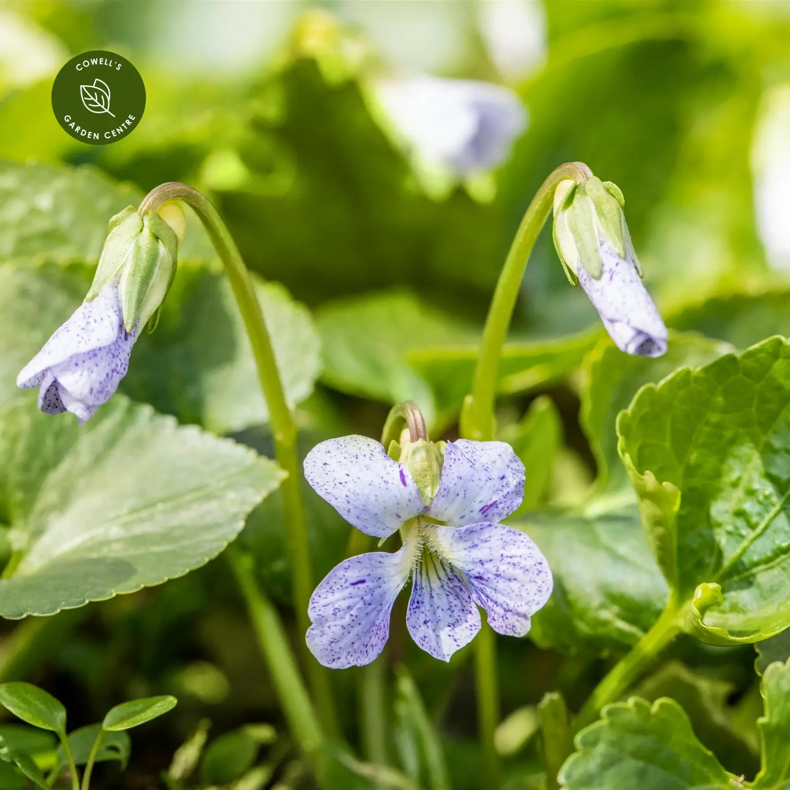 Viola 'Freckles' is a charming, low-growing perennial producing delicate white flowers heavily speckled with violet-blue markings. Its unique patterning adds subtle detail and interest to spring planting schemes.