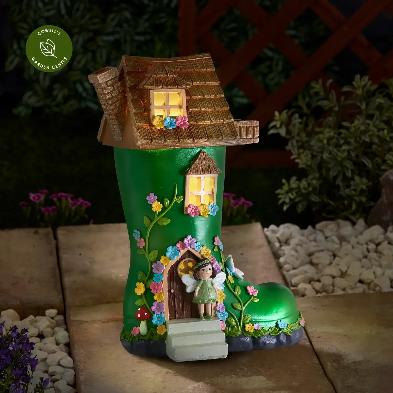 Add a touch of charm to your garden with this decorative fairy house that lights up after dark. Beautifully hand painted, it works as a feature by day and a soft glowing light by night, creating a magical feel in borders, pots or pathways. Solar powered for simple, wire-free use.