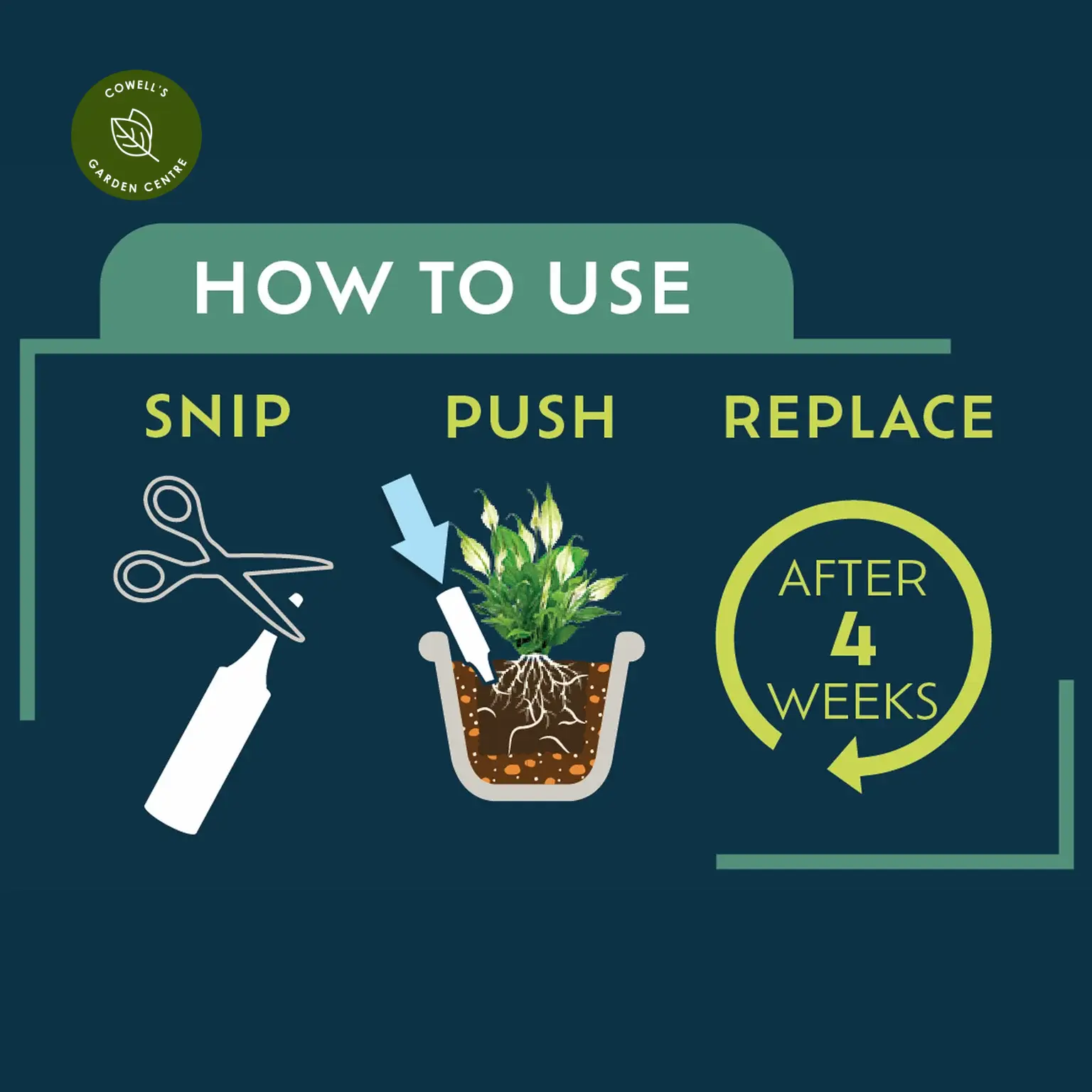 Westland Houseplant Droplet Feeder is a convenient ready to use feed that keeps houseplants healthy. It contains all the essential nutrients houseplants need for healthy growth and greener leaves. Simply, snip off the top and push into the compost and it will feed your plants for four weeks.