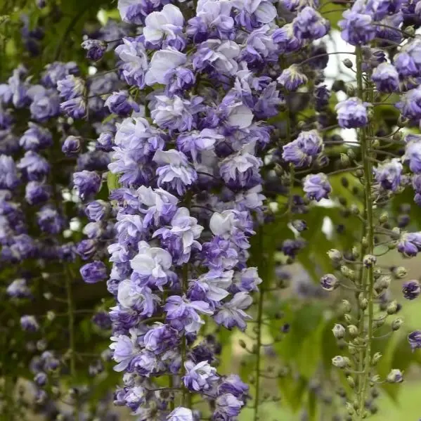 Wisteria x floribunda Grande Diva 'Cecilia' is the first floribunda variety to produce double lavender-blue and white flowers, creating an exceptional cascade of fragrant blooms from May to June. The long, elegant racemes are richly scented and melliferous, attracting pollinators while delivering a truly show-stopping spring display – often flowering generously from just the first few years.