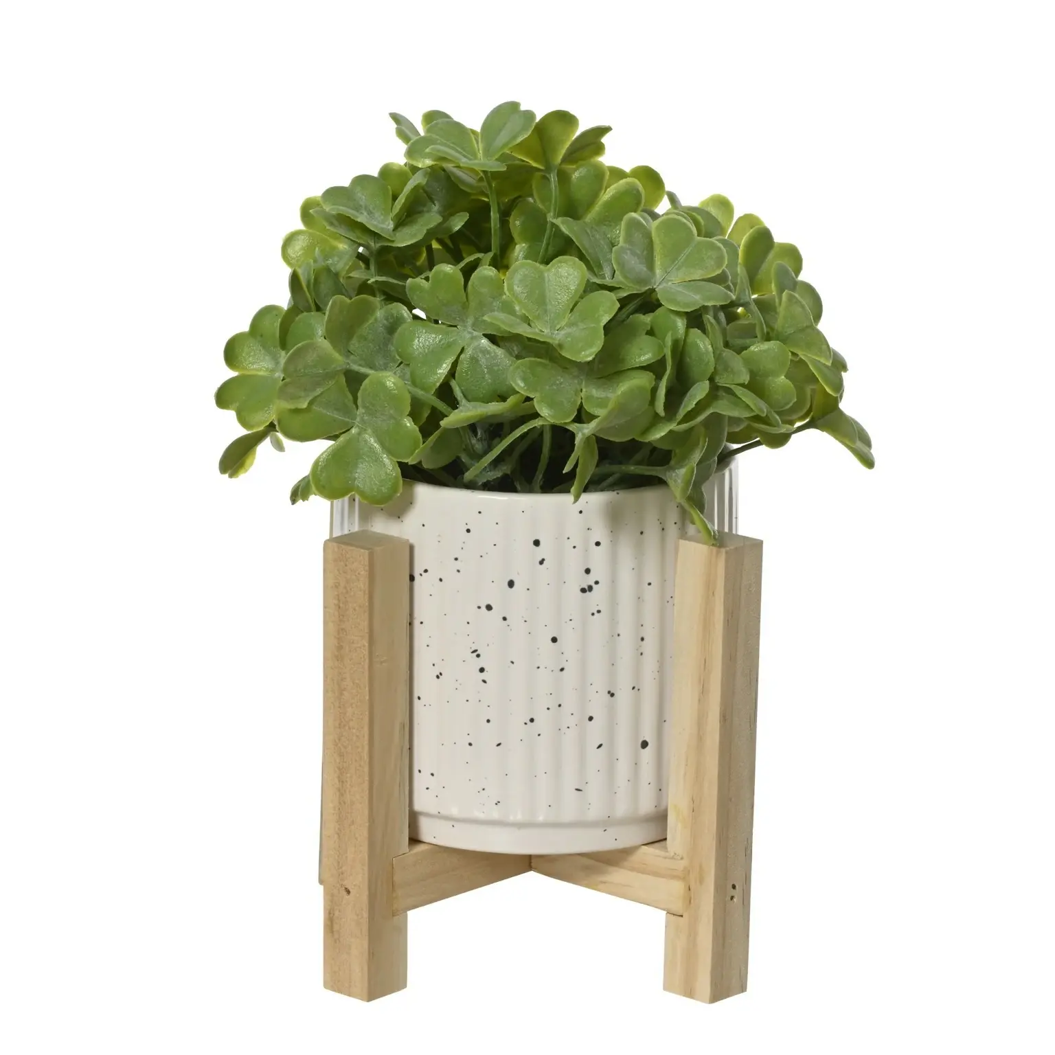 Stylish artificial green plant presented in a decorative ceramic pot with a natural wooden frame, ideal for adding texture and interest to interior displays.