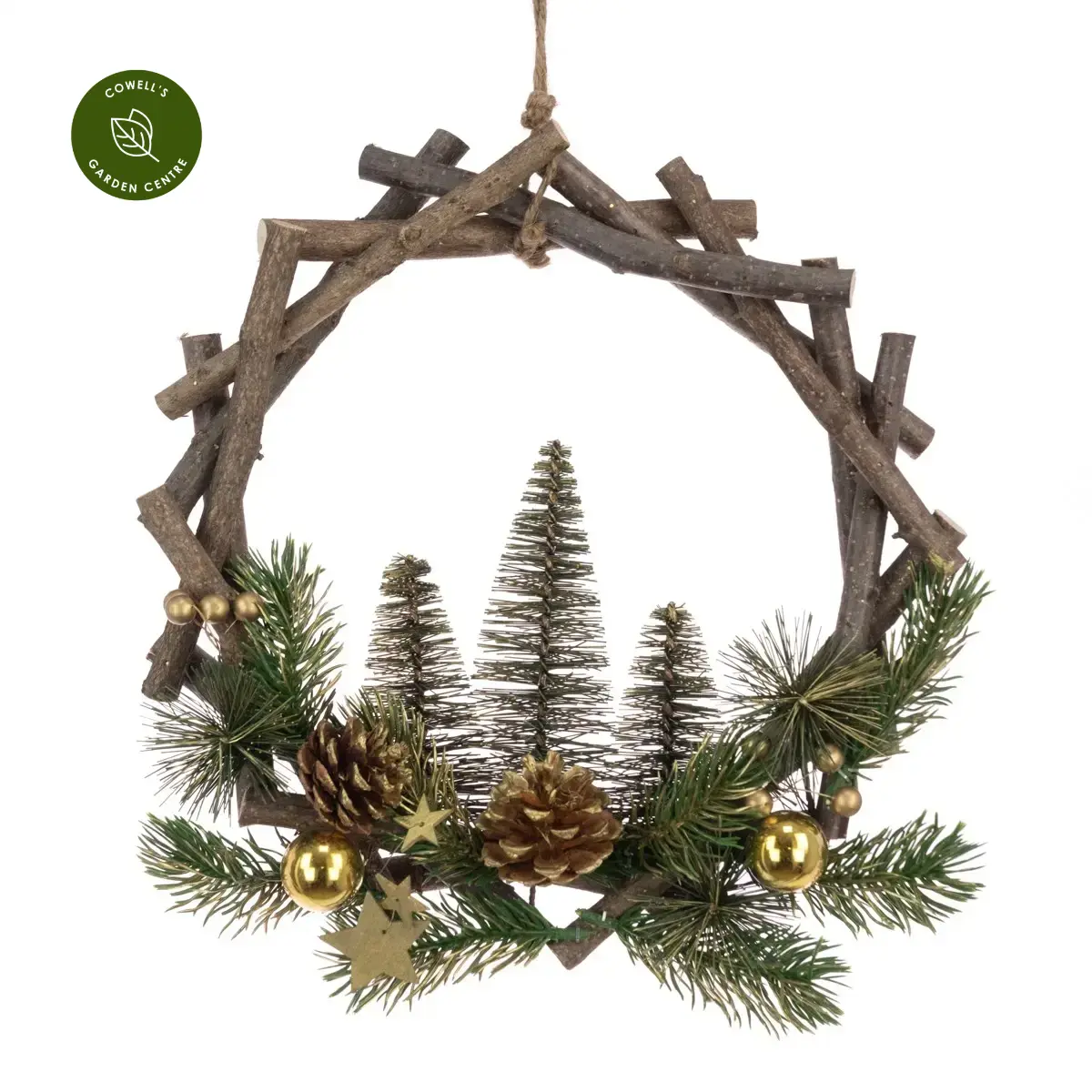 Rustic wreath combining an assortment of branches, artificial foliage and pinecones, to hang on your door, or to elevate your Christmas displays.