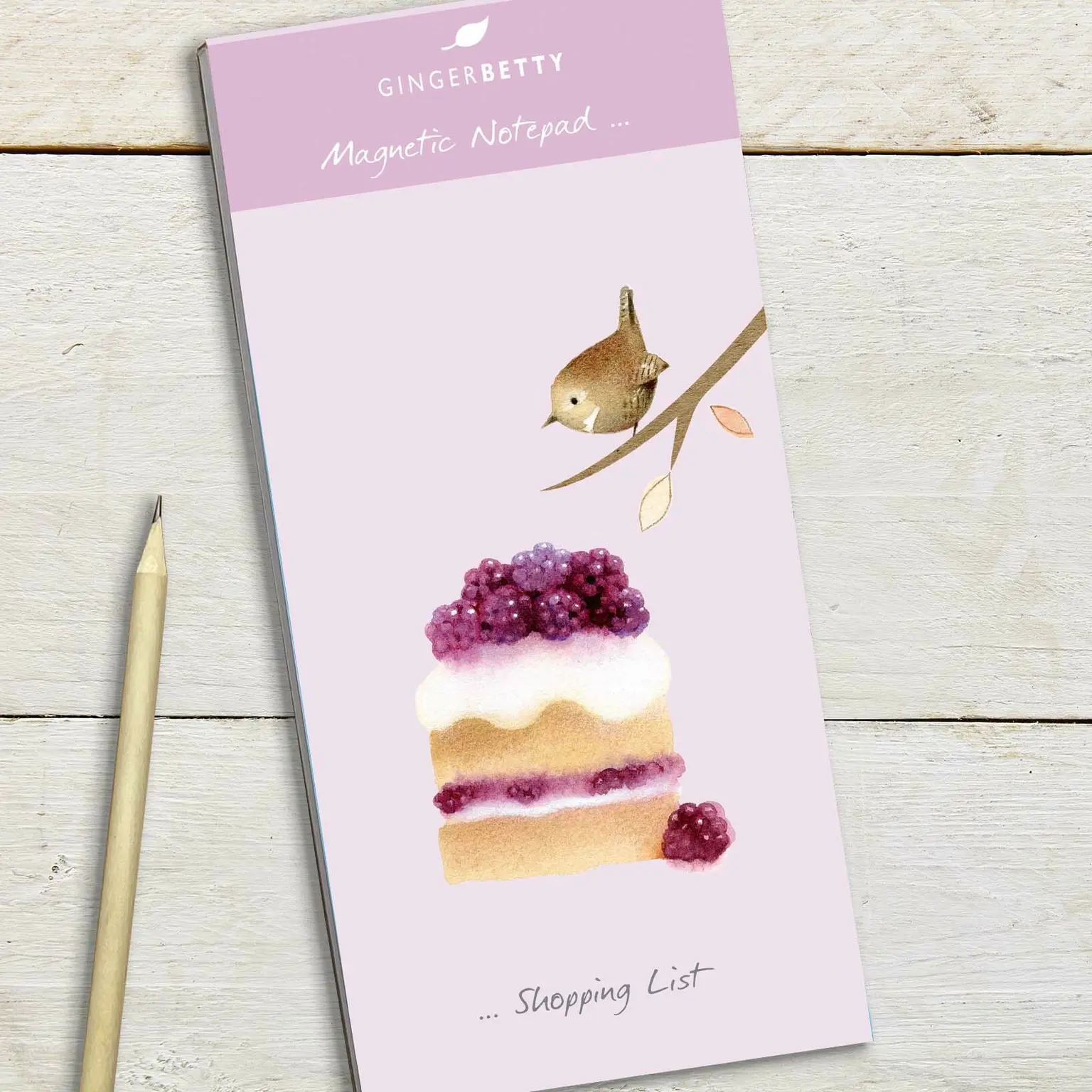 Magnetic Notepad/To do List. Cover is coloured pale lilac, with a cute wren and cake, and ‘Shopping List’ wording.