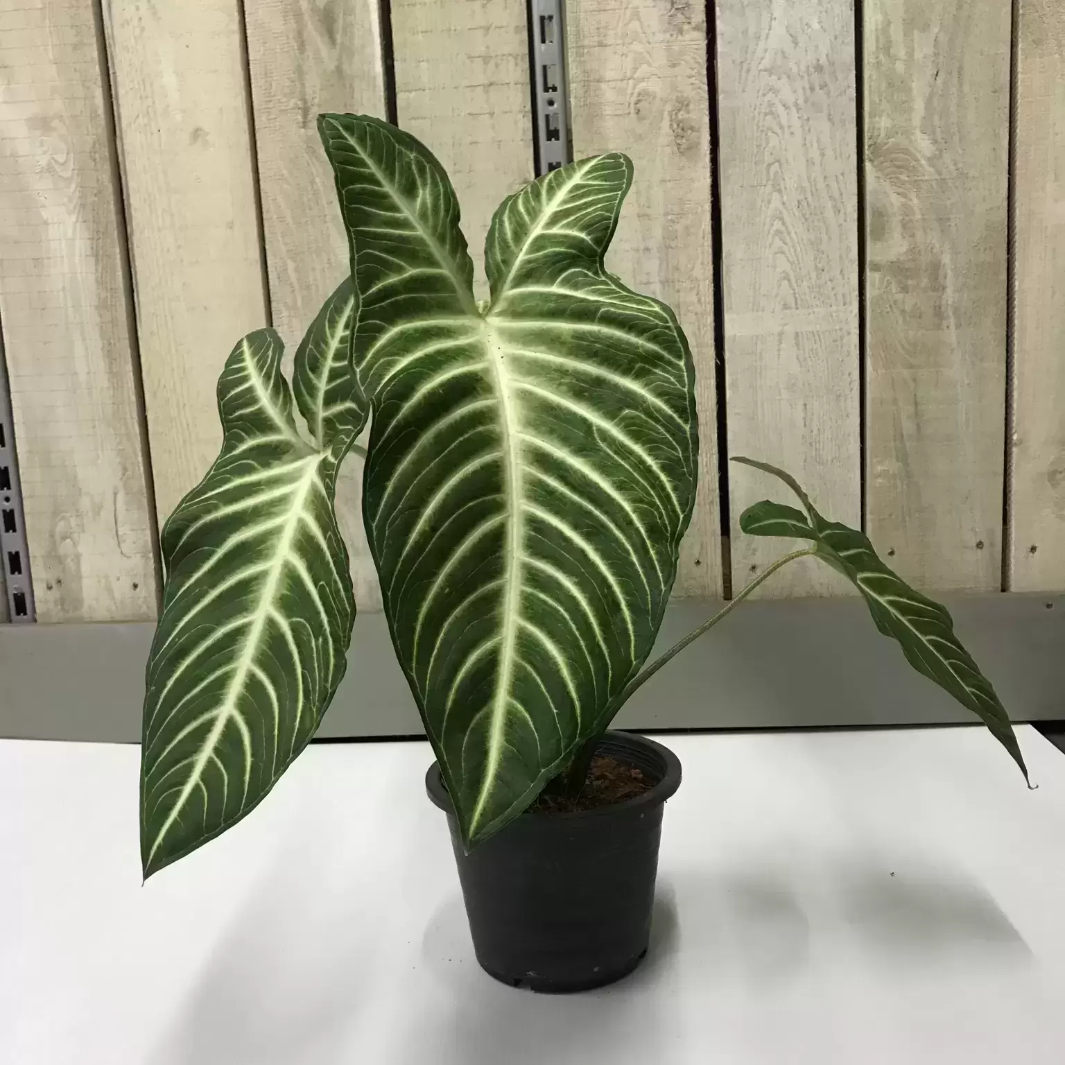 Xanthosoma lindenii ‘Magnificum’ is an impressive tropical foliage plant showcasing striking, arrow-shaped leaves marked with vivid white veins against deep green backgrounds. The bold contrast and large leaf size create an elegant, architectural statement in any interior space.