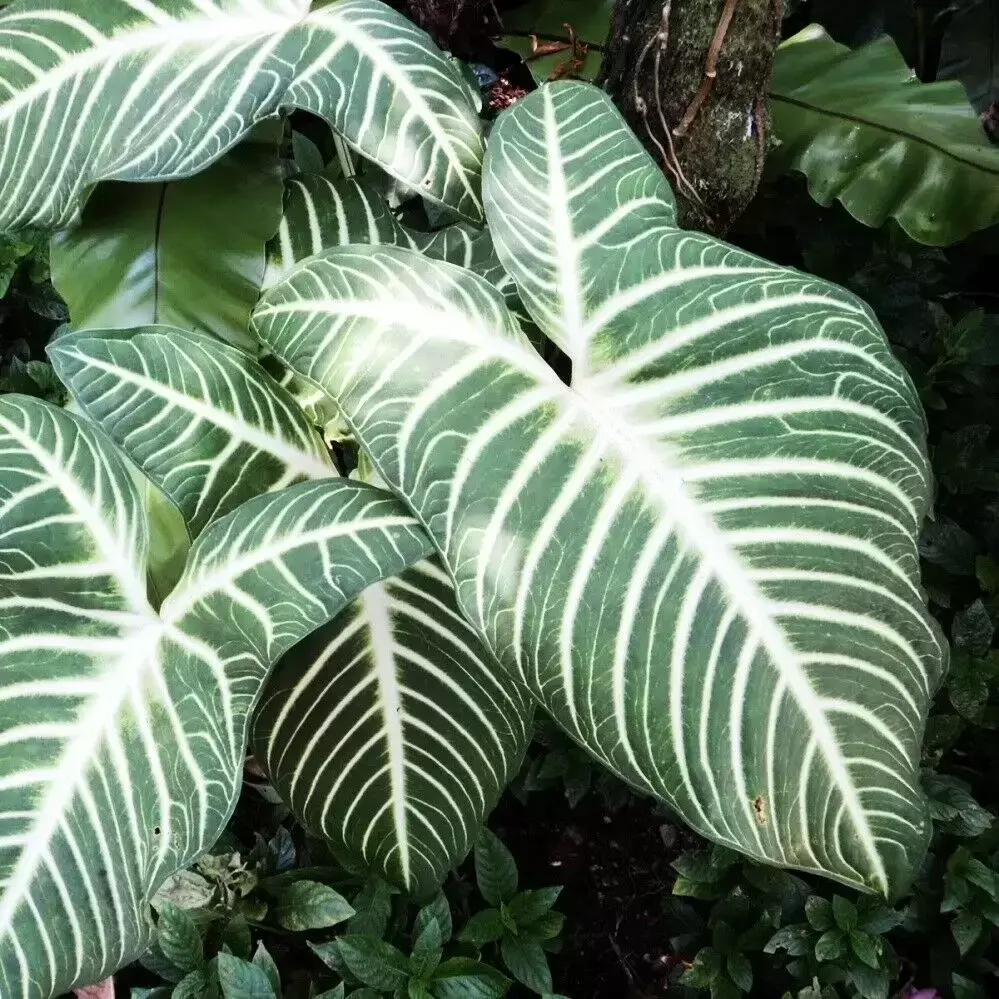 Xanthosoma lindenii ‘Magnificum’ is an impressive tropical foliage plant showcasing striking, arrow-shaped leaves marked with vivid white veins against deep green backgrounds. The bold contrast and large leaf size create an elegant, architectural statement in any interior space.