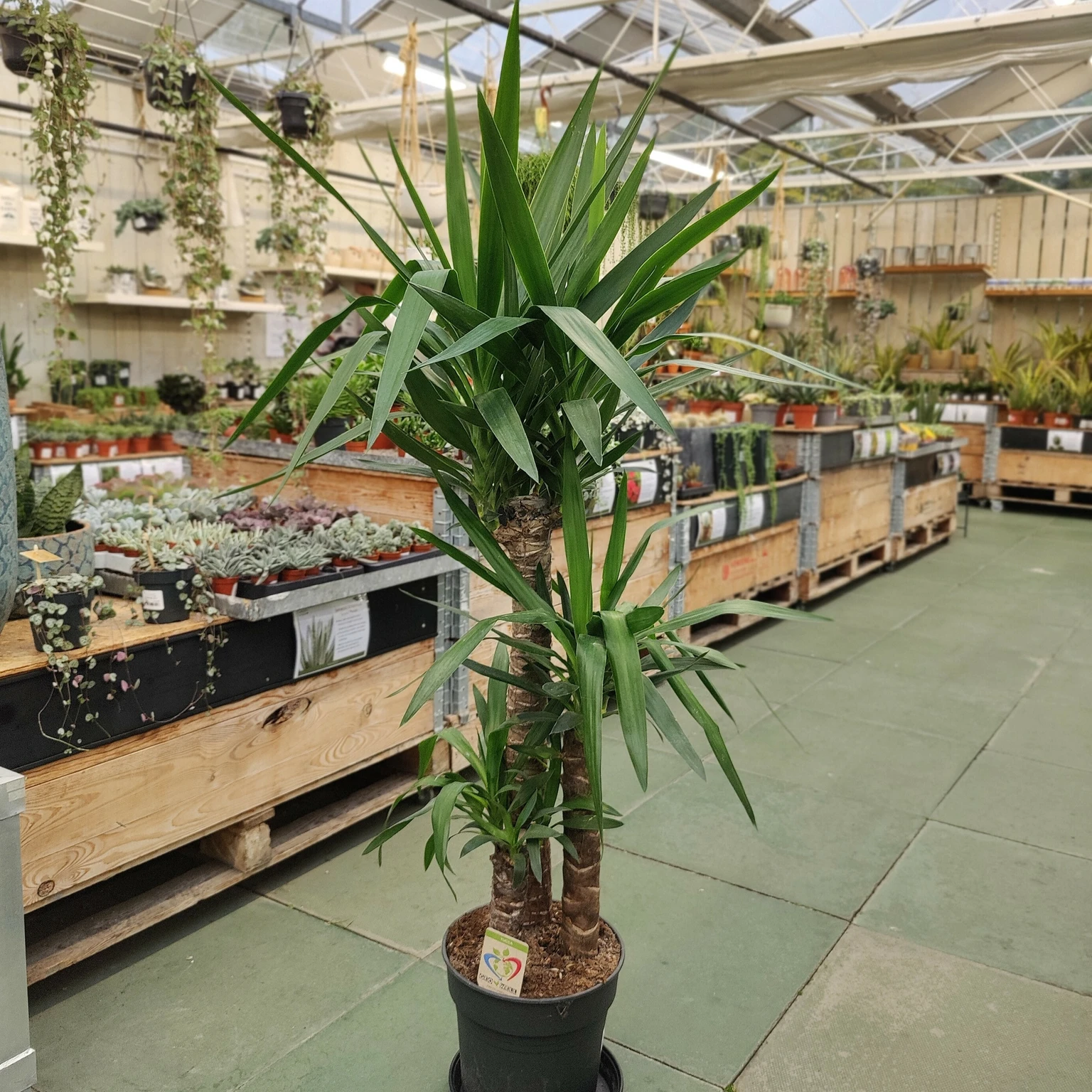 Yucca elephantipes is a hardy indoor tree with thick, cane-like stems topped by rosettes of sword-shaped green leaves. Known as the Spineless Yucca, it is much easier to handle than other yucca species, bringing bold, architectural structure to homes, offices, and conservatories.